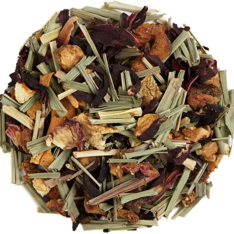 Appel, citroengras, hibiscus, sinaasappel, munt. 100% natuurlijk, zonder toegevoegde aroma’s.