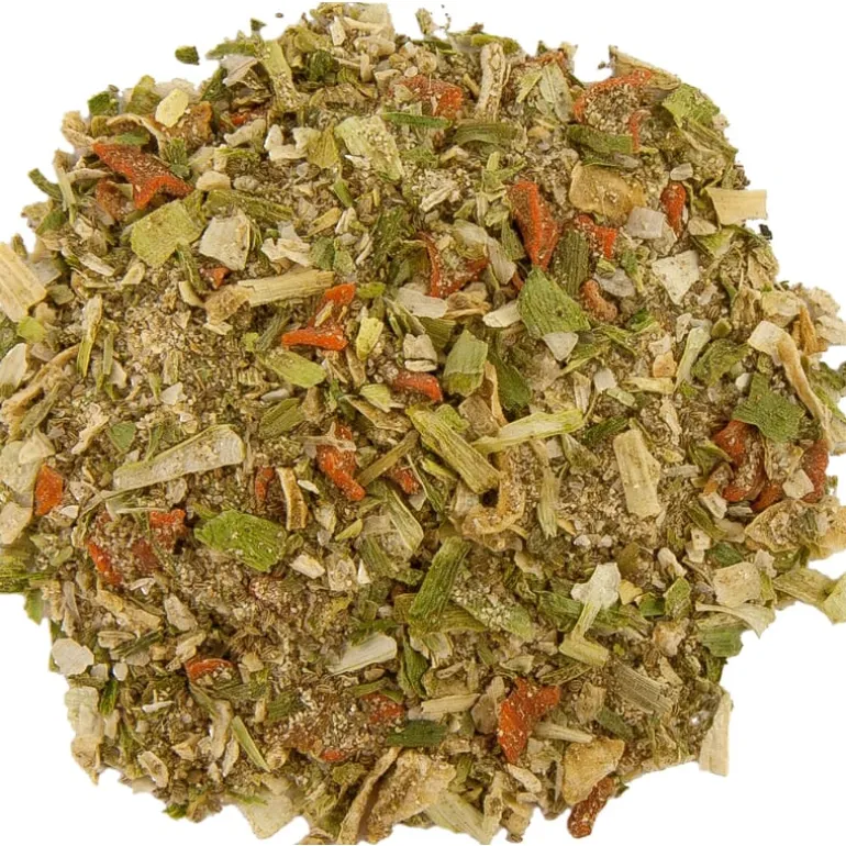 Uien, wortelen, zeezout, prei, knoflook, peper, selderij, bieslook.