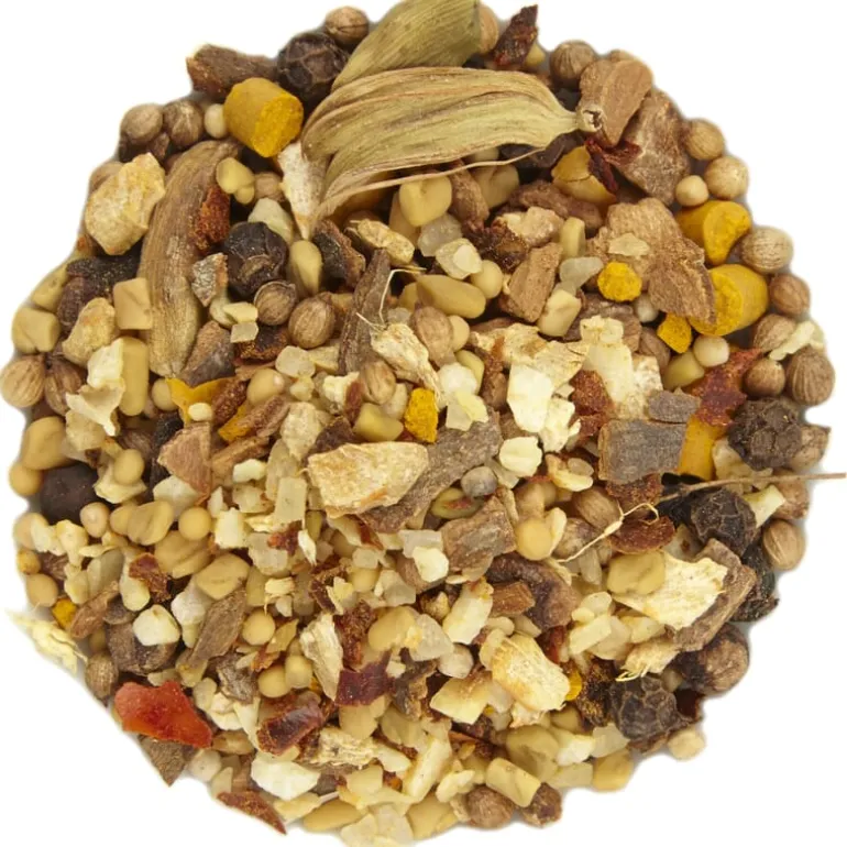 Kurkuma, koriander, knoflook, peper, fenegriek, zout, chili, mosterdzaad, gember, kardemom, kruidnagel, kaneel. 100% natuurlijk en zonder additieven.