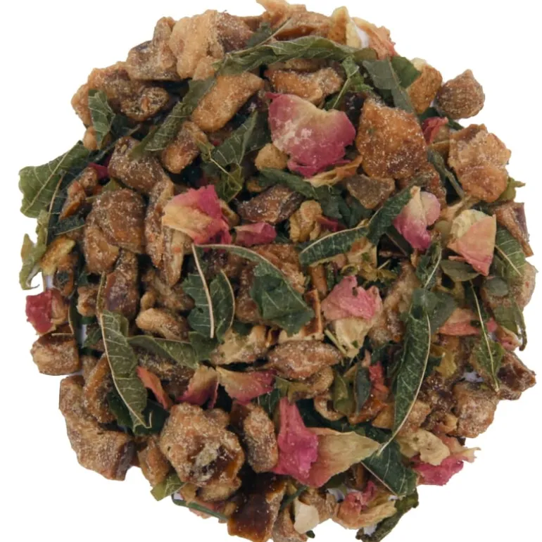 Dadel (dadel, rijstmeel), natuurlijk grapefruitaroma, verbena heel, sinaasappelschillen*, passiebloemkruid*, rozenblaadjes* (3%), HAZELNOOT*, natuurlijk bergamotaroma, guarana* (1%), (*), afkomstig van biologische landbouw.