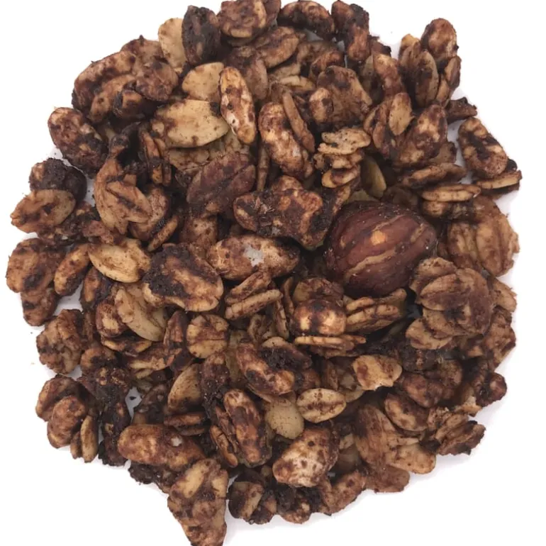Deze granola met mokkasmaak is heerlijk met plantaardige melk, yoghurt, vers fruit of sap. Je kan het ook als crumble strooien over desserts en ijs. Een handje van deze knapperige granola is ook een lekker tussendoortje doorheen de dag.