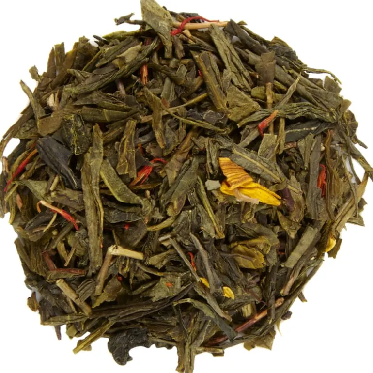 Groene Sencha thee, natuurlijk aroma, saffloerbloesem, zonnebloembloesem.