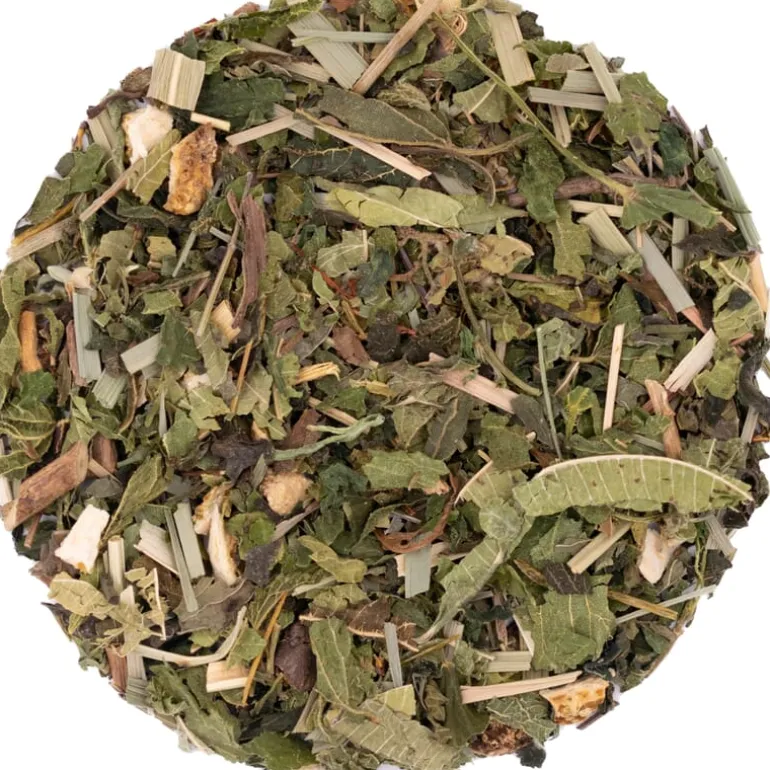 Brandnetelblad*, rooibos*, pepermunt*, citroengras*, citroenverbena*, zoethoutwortel*, citroenschil* (*) van gecertificeerde biologische landbouw