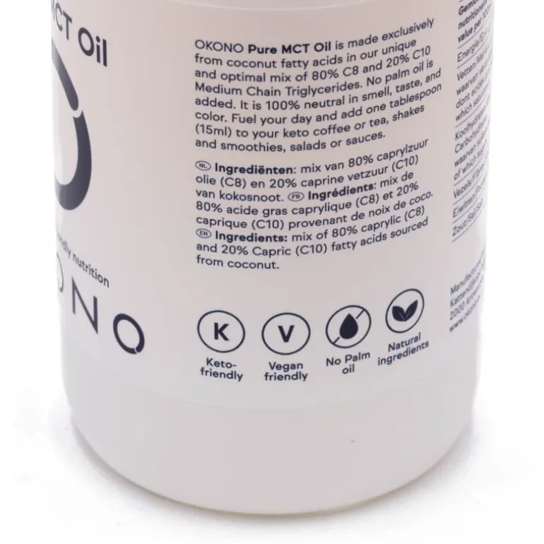 Mix van 80% caprylzuur olie (C8) en 20% caprine vetzuur (C10) van kokosnoot. 100% natuurlijk zonder additieven.