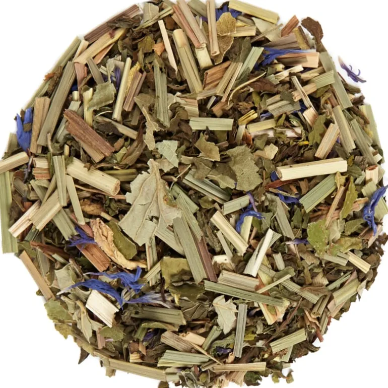 Pepermunt, citroengras, munt, aardbeiblad, zoethout, korenbloem, kardemom, rozenblaadjes. 100% biologisch, zonder toegevoegde aroma’s.