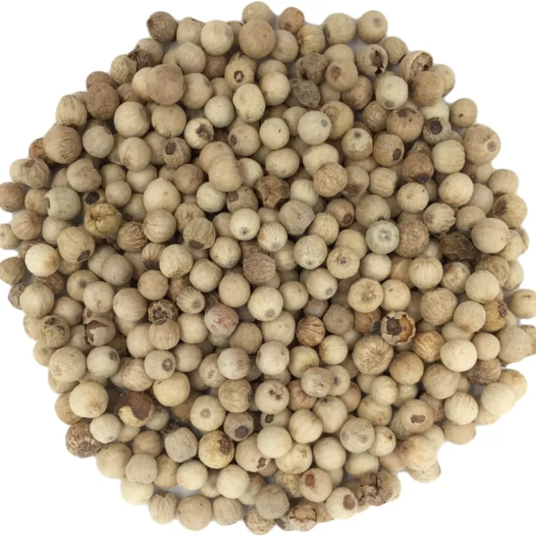 De rijpe peperbessen worden na de oogst geweekt in water en gedroogd in de zon, waardoor de buitenschil afvalt en de peperbol wit is. Deze peper heeft een milde, verfijnde en warme warme smaak. Ongemalen verliest de peper heel weinig smaak over de tijd.