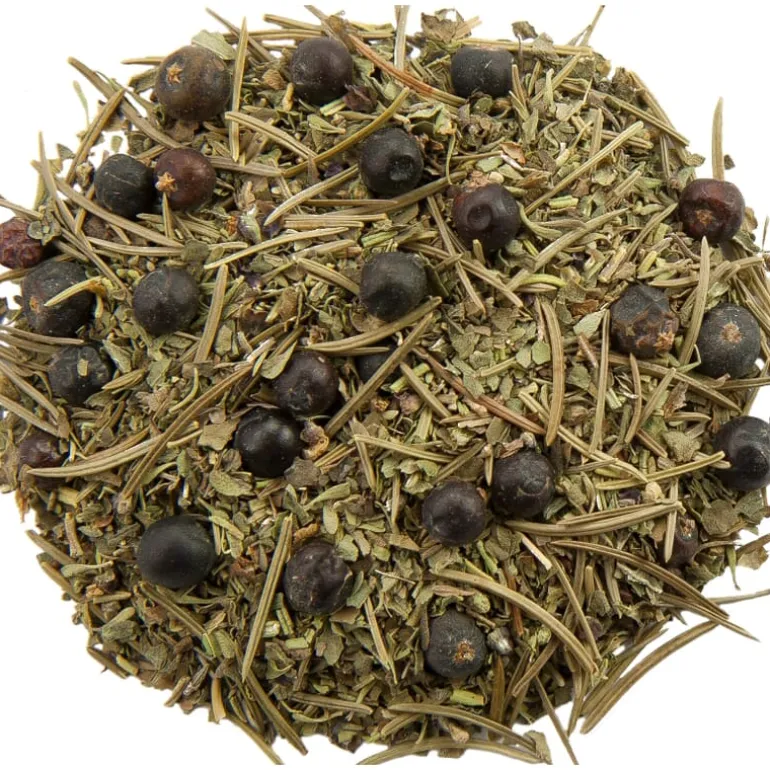 Basilicum, jeneverbessen, rozemarijn, tijm, dennennaalden.