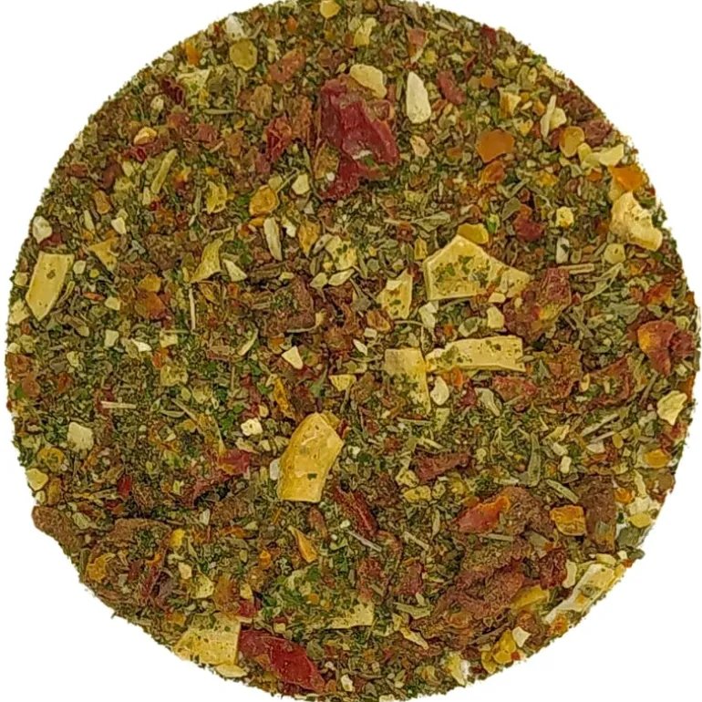 Tomatenvlokken*, knoflook*, ui*, peterselie*, oregano*, basilicum*, tijm*, chili*, peper* van biologische teelt