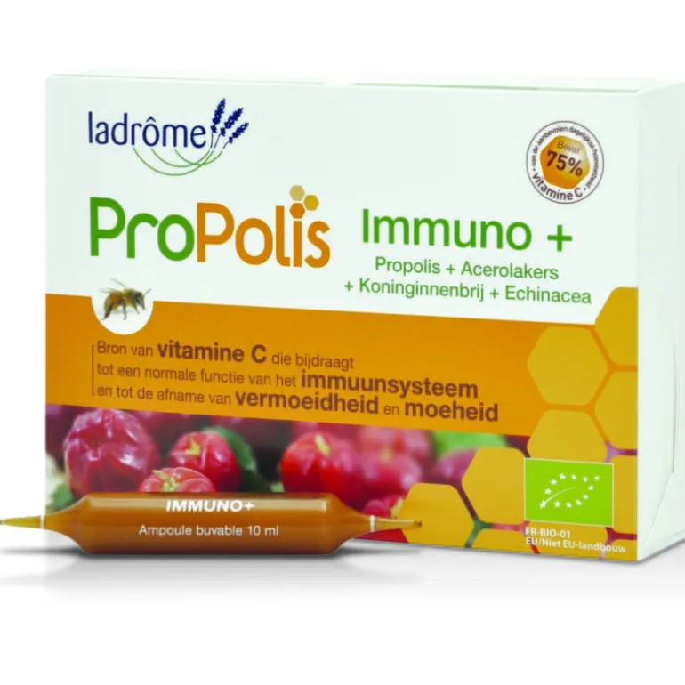 Immuno+ propolis+ ampules van Ladrôme verhogen de natuurlijke weerstand. Ze vergroten de veerkracht en vitaliteit bij ongunstige omstandigheden. Eén ampule bevat maar liefst 75% van de aanbevolen dagelijkse hoeveelheid vitamine C. Een echt duwtje in de rug.