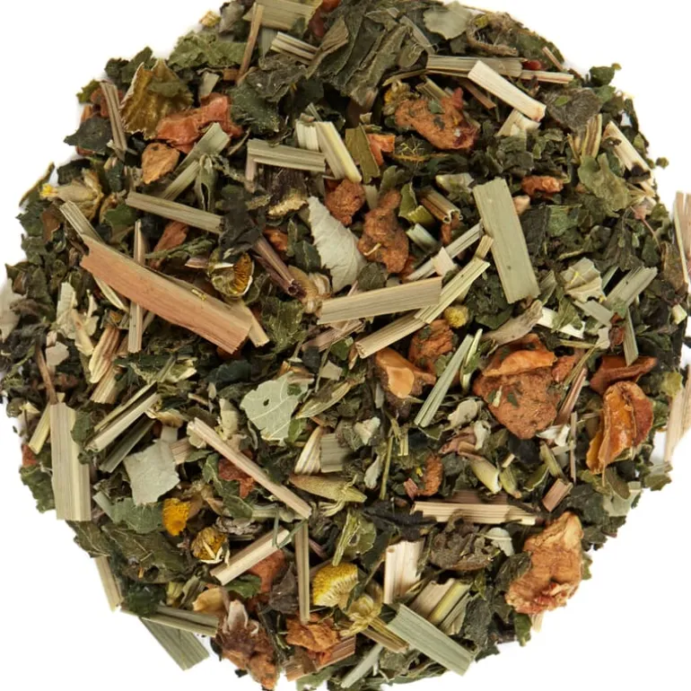 Brandnetel, appel, citroengras, venkel, kamille, braamblad. 100% natuurlijk en puur, zonder toegevoegde aroma’s. Uit biologische landbouw.