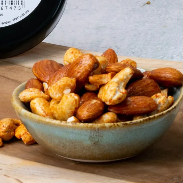 Deze notenmix met droog geroosterde pinda’s en noten brengen we op smaak met ahornsiroop en chili’s. Ze zijn lichtjes zoet door een scheutje natuurlijke ahornsiroop. Die zoete toets in combinatie met de wat pikante chili-paprika mengeling resulteert in een hemelse borrelnoot!