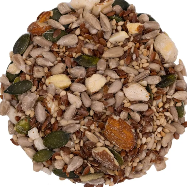 Voeg de broodmix toe, bestaande uit een uitgebalanceerde combinatie van zonnebloempitten, lijnzaad, sesamzaad, pompoenpitten, amandelen, paranoten en walnoten. Voeg 50 ml extra vierge olijfolie toe (optioneel: voeg extra kruiden toe naar wens).