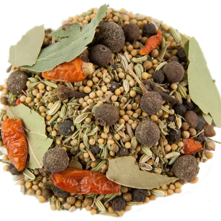 Deze mooie gemengde kruidenmix gebruik je bij het inmaken van augurken, ui, … De inmaakkruiden of pekelkruiden bevatten traditionele kruiden voor het pekelen of inmaken zoals mosterdzaad, venkel, peper, piment, rawit (pili-pili), tijm, majoraan, koriander, laurier en kruidnagel.