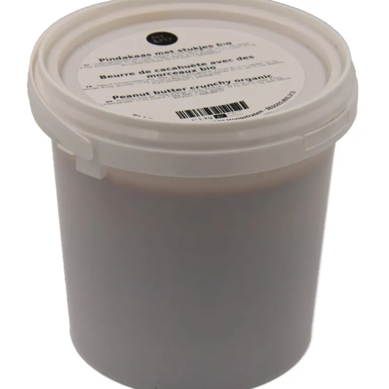 Onze natuurlijke pindakaas met stukjes is biologisch gecertificeerd en helemaal vrij van toevoegingen. We maken het zonder palmolie of andere toegevoegde stoffen.